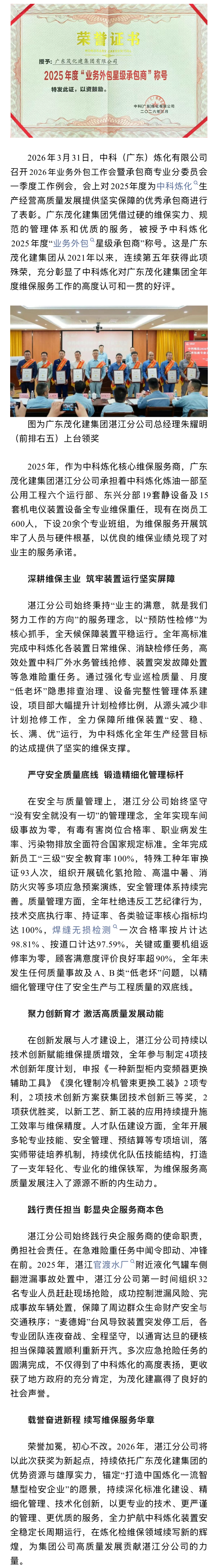 喜報|榮獲中科煉化2025年度“ 業(yè)務(wù)外包星級承包商”稱號