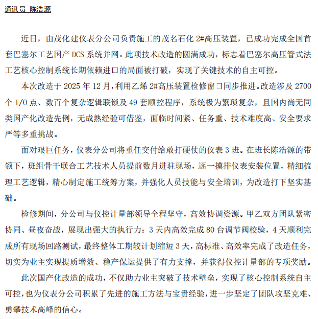 儀表分公司圓滿完成全國(guó)首套巴塞爾工藝國(guó)產(chǎn)DCS 系統(tǒng)并網(wǎng)改造