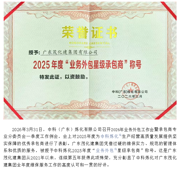 喜報|榮獲中科煉化2025年度“ 業(yè)務(wù)外包星級承包商”稱號